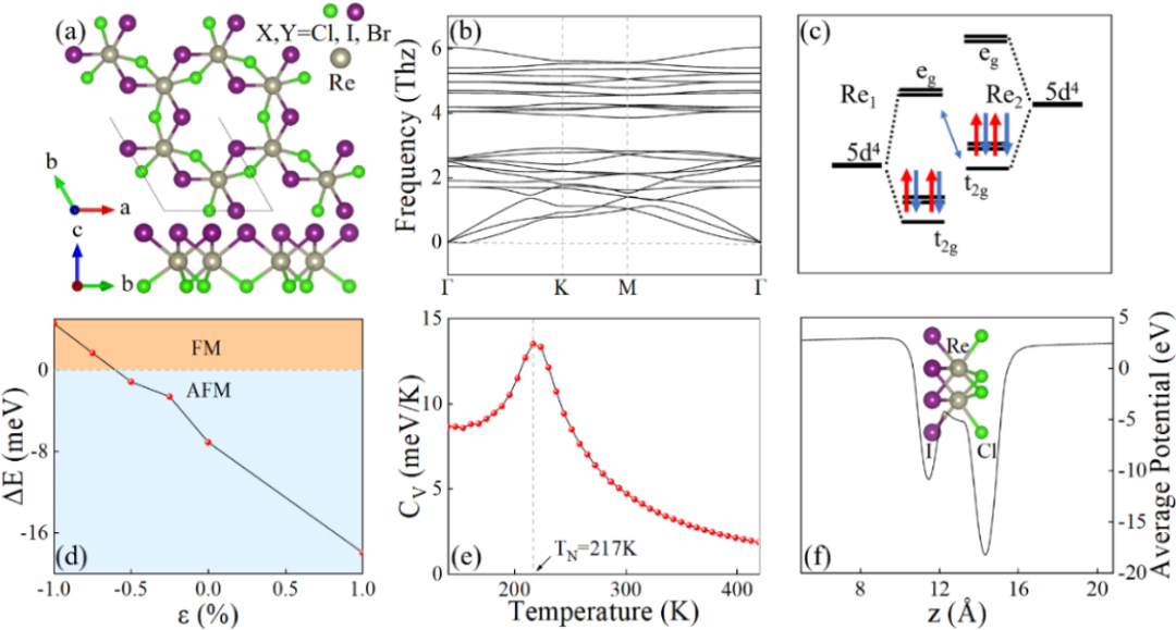 FIG. 1. (a) Top and side views of Re2X3Y3(X, Y=I, Br, Cl; X ≠ Y) monolayers. (b) Phonon dispersion spectrum of Re2I3Cl3monolayer. (c) Schematic diagram of octahedral Re 5d orbital splitting. (d) The strain ε dependences on magnetic exchange energy ΔE for the Janus Re2I3Cl3monolayer. (e) The temperature dependences on specific heat capacity and (f) average electric potential along z direction for the Janus Re2I3Cl3monolayer.