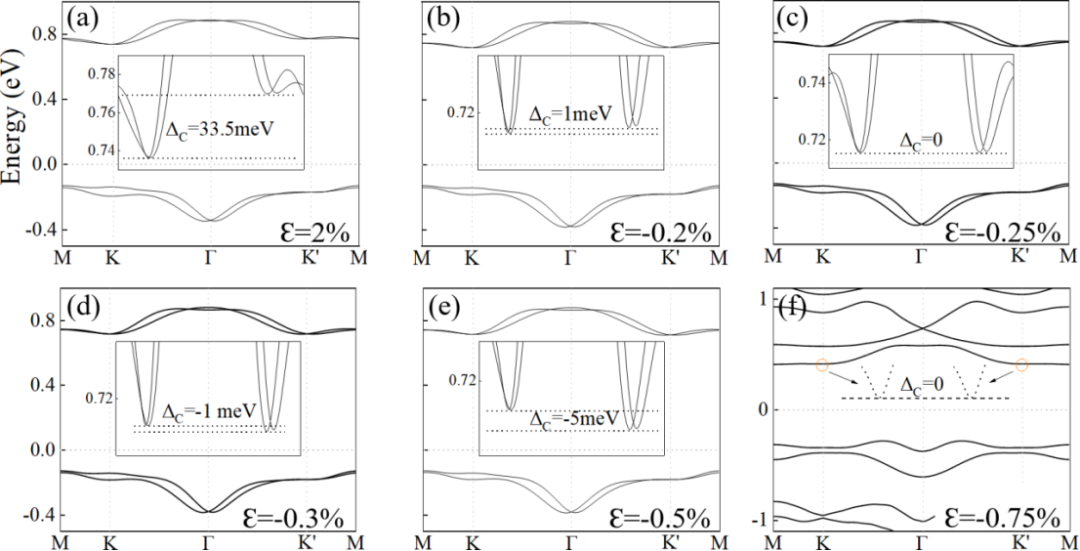 FIG. 3. The band structures of the Re2I3Cl3monolayer at strains of (a) 2%, (b) -0.2%, (c) -0.25%, (d) -0.3%, (e) -0.5% and (f) -0.75% with SOC.