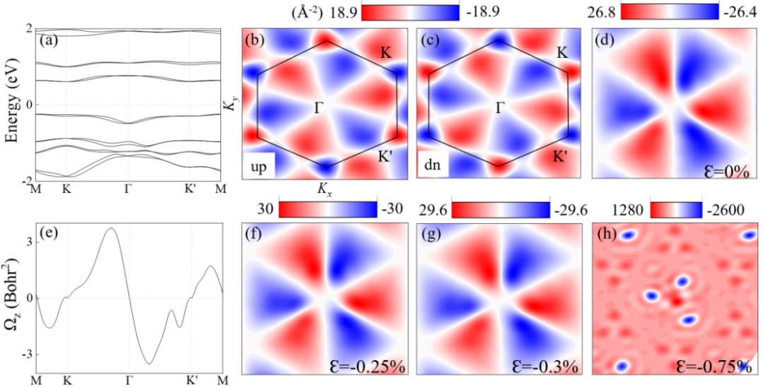 FIG. 4. (a) The calculated band structure of the Re2I3Cl3monolayer using MLWF. Berry curvatures of the (b) spin-up and (c) spin-down channels on the 2D BZ for the Re2I3Cl3monolayer. Berry curvatures on the (d) 2D BZ and (e) along the high symmetry line with SOC for the Re2I3Cl3monolayer. Berry curvatures on the 2D BZ at strains of (f) -0.25%, (g) -0.3%, and (h) -0.75% with SOC for the Re2I3Cl3monolayer.