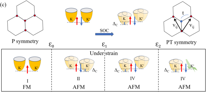 FIG. 2. The band structures of the Re2I3Cl3monolayer (a) without and (b) with considering SOC. For the conduction band,. (c) Schematic diagram of bulk bands around K and K' points. The red (blue) arrows indicate the up (down) spin. I represent FM state, while II, III, and IV represent AFM states under various strains.