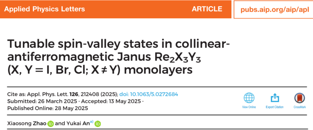 论文信息:Xiaosong Zhao, Yukai An, Tunable spin-valley states in collinear antiferromagnetic Janus Re2X3Y3(X, Y= I, Br, Cl; X≠Y) monolayers, Applied Physics Letters 2025, 126, 212408. https://doi.org/10.1063/5.0272684