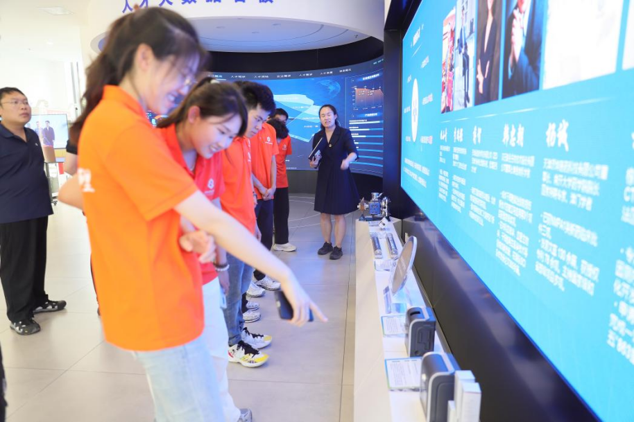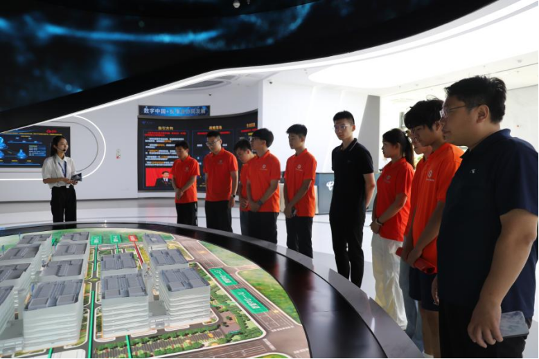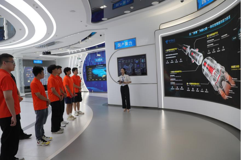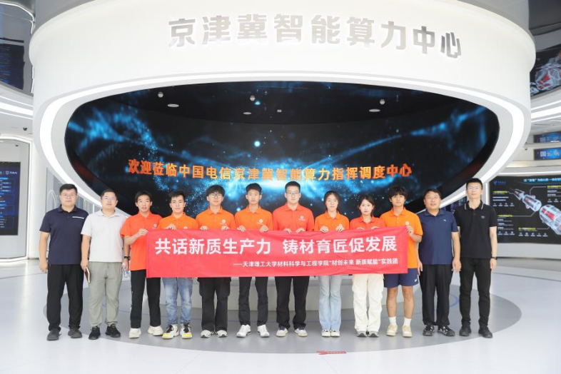 第一站,实践团走进中国电信智能算力中心。中国电信京津冀国产液冷万卡智算池是中国电信贯彻落实东数西算战略、打造京津冀晋蒙算力供给走廊的重要举措。在现场,讲解员通过讲述新质生产力赋能科技振兴的相关情况,让同学们直观的感受到智能算力在工业互联网、数字孪生等领域的落地应用清晰可见,数据要素与材料研发、制造流程的融合路径愈发明晰,数字技术为新质生产力注入的“硬核动力”,也在实践中变得可触可感。随后实践团还参观了单集群万卡智算池的内部机房,团队成员们大受震撼。